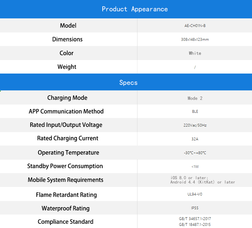 AE-CH01N-B is a portable new energy vehicle charging device with charging mode 2, and the charging gun adopts a Designed with a maximum charging current of 32A. The main functions include the control of the mobile app and the button control of the charging gun itself. On the mobile app, it supports three modes: timely charging, quantitative charging, and timed charging. It displays the current voltage, charging current, power, active energy, current temperature, and CP status, and also supports independent use without the app.